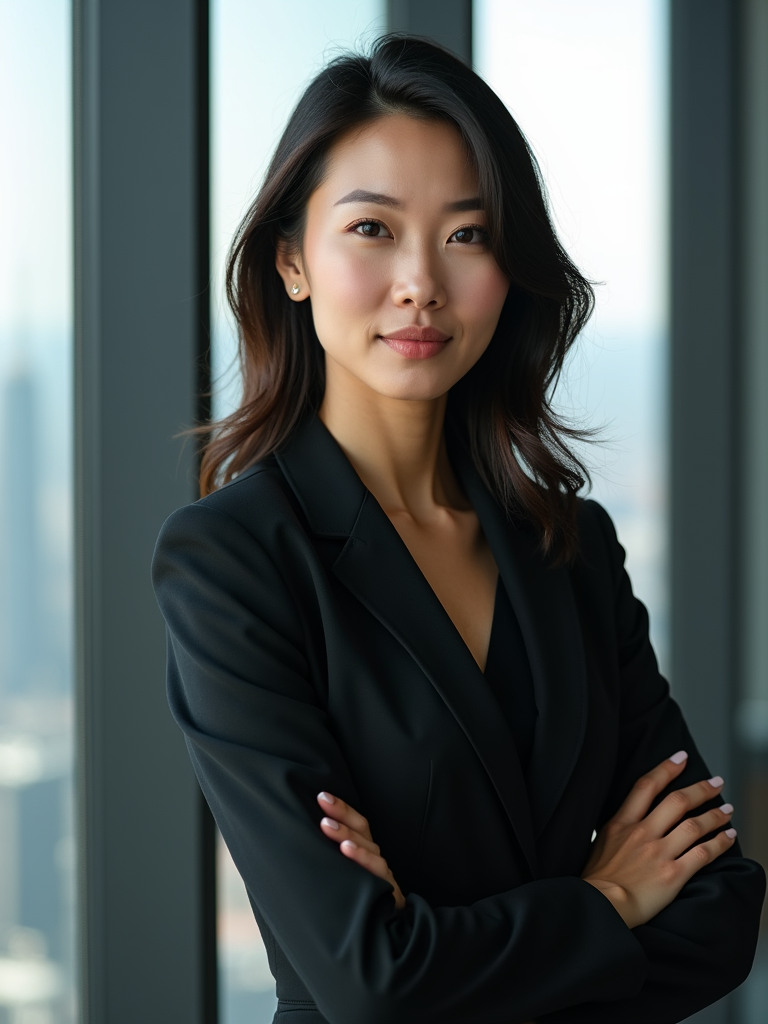 8k professional headshot of model as CEO, crisp details, premium studio backdrop, executive business attire, commanding posture, confident expression, high-definition, corner office setting, sharp focus, dramatic lighting, power suit, cityscape view