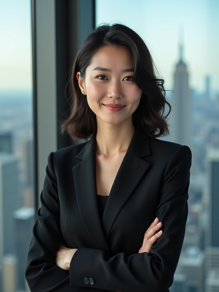 8k professional headshot of model as CEO, crisp details, premium studio backdrop, executive business attire, commanding posture, confident expression, high-definition, corner office setting, sharp focus, dramatic lighting, power suit, cityscape view