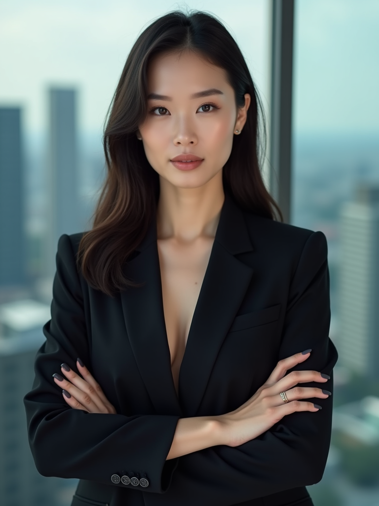8k professional headshot of model as CEO, crisp details, premium studio backdrop, executive business attire, commanding posture, confident expression, high-definition, corner office setting, sharp focus, dramatic lighting, power suit, cityscape view