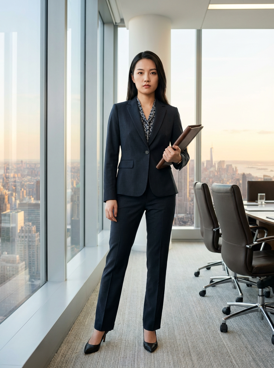 8k professional headshot of model as executive leader, crisp details, luxury office backdrop, premium tailored attire, authoritative pose, decisive expression, high-definition, boardroom environment, sharp focus, professional lighting, executive presence, skyscraper view