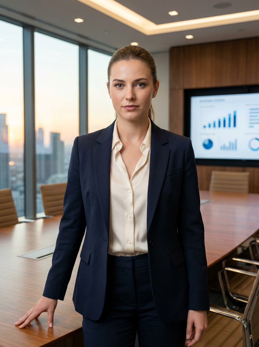8k professional headshot of model as executive leader, crisp details, luxury office backdrop, premium tailored attire, authoritative pose, decisive expression, high-definition, boardroom environment, sharp focus, professional lighting, executive presence, skyscraper view