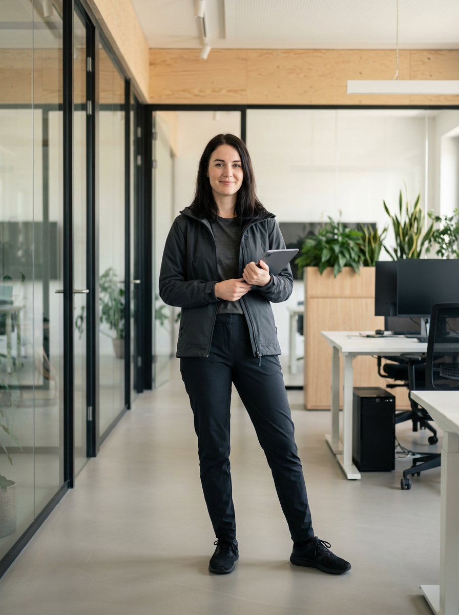 8k professional headshot of model, crisp details, bright modern office, casual tech wear, relaxed confident pose, approachable smile, high-definition, startup vibe, sharp focus, soft lighting, smart casual outfit, contemporary setting