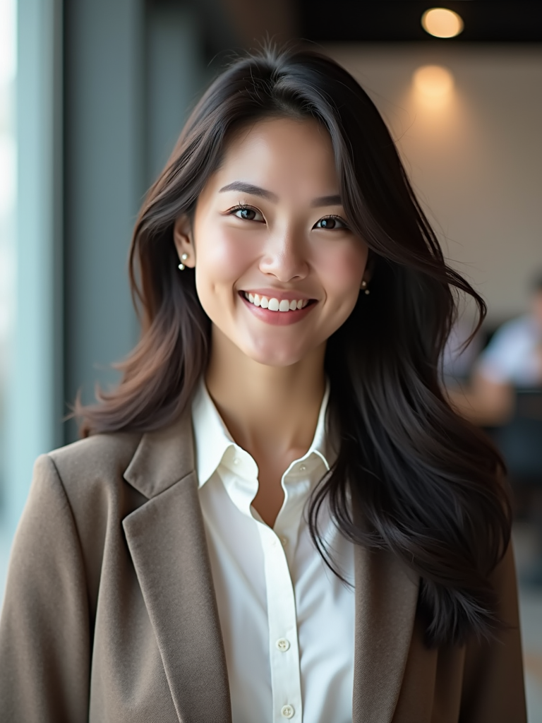 8k professional headshot of model, crisp details, studio backdrop, casual smart attire, confident posture, friendly expression, high-definition, modern startup environment, sharp focus, natural lighting, business casual, open workspace background