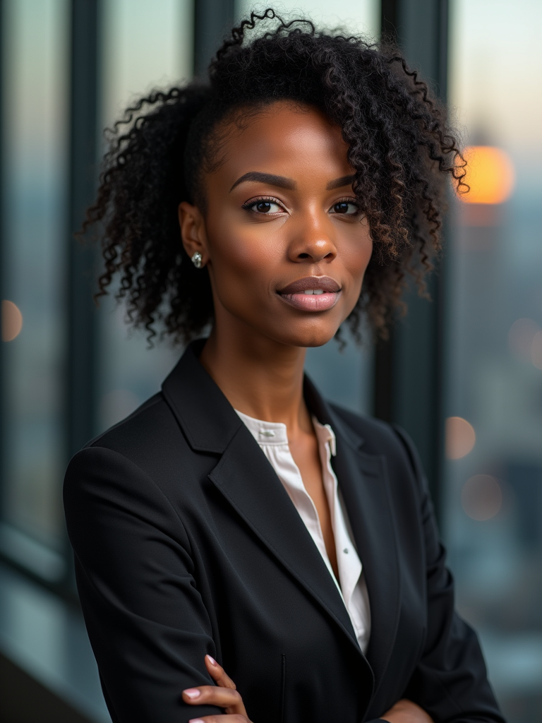 8k professional headshot of model, crisp details, studio backdrop, executive attire, confident posture, neutral expression, high-definition, corporate setting, sharp focus, ambient lighting, business professional, cityscape view