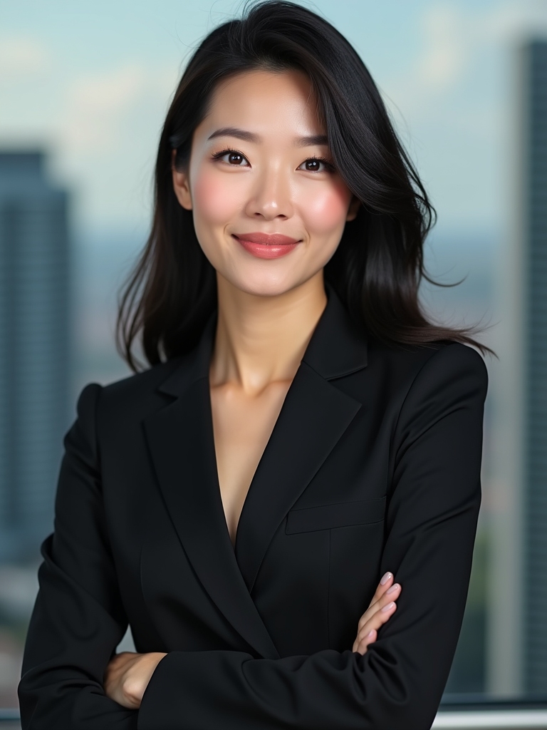 8k professional headshot of model, crisp details, studio backdrop, executive attire, confident posture, neutral expression, high-definition, corporate setting, sharp focus, ambient lighting, business professional, cityscape view