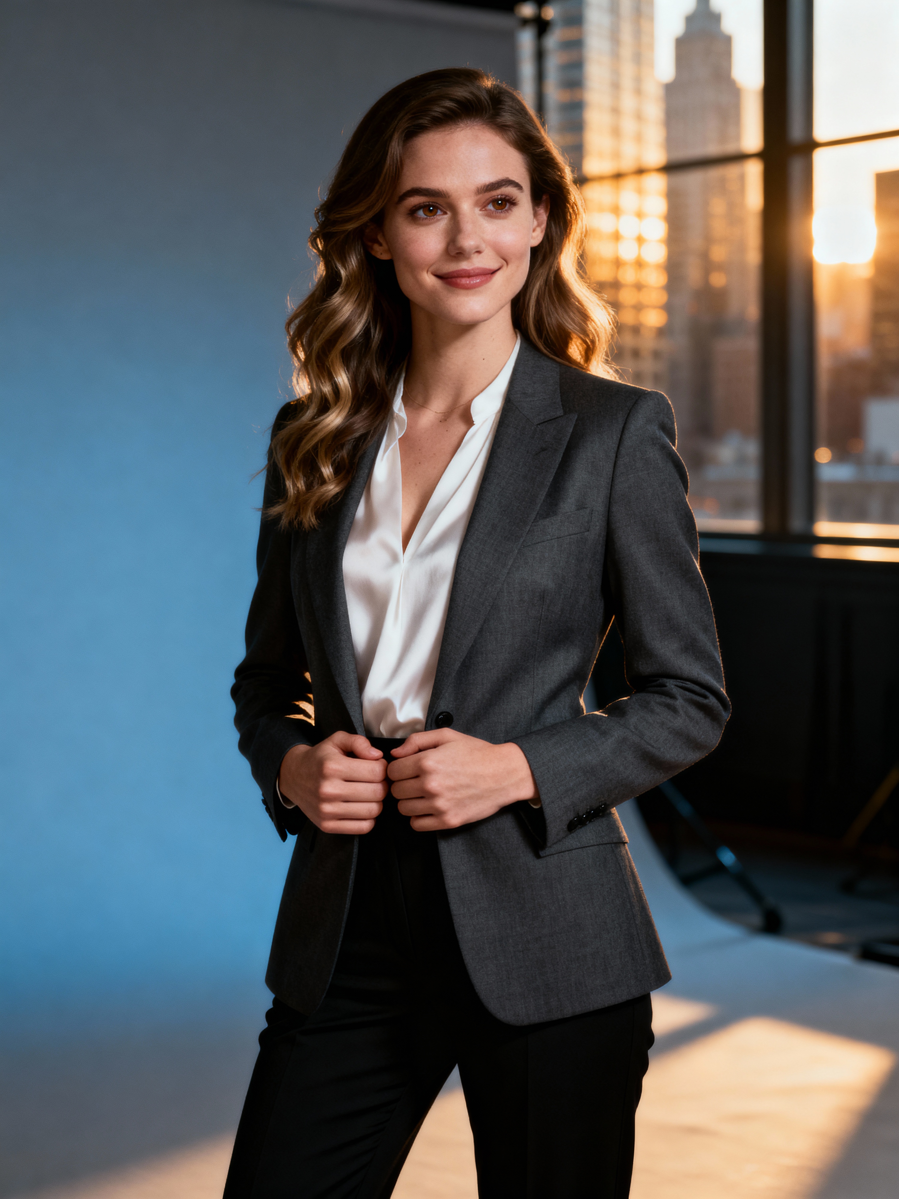 8k professional headshot of model, crisp details, studio backdrop, executive attire, confident posture, neutral expression, high-definition, corporate setting, sharp focus, ambient lighting, business professional, cityscape view