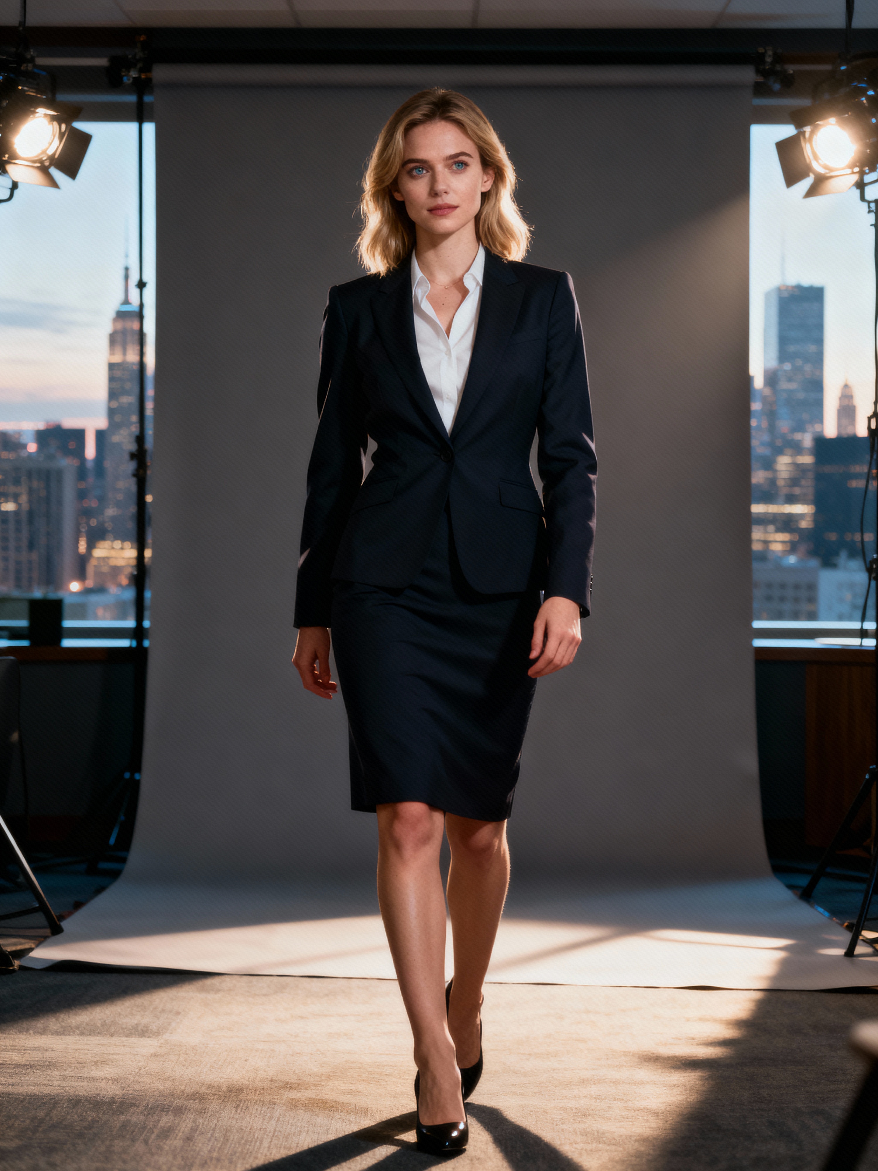 8k professional headshot of model, crisp details, studio backdrop, executive attire, confident posture, neutral expression, high-definition, corporate setting, sharp focus, ambient lighting, business professional, cityscape view