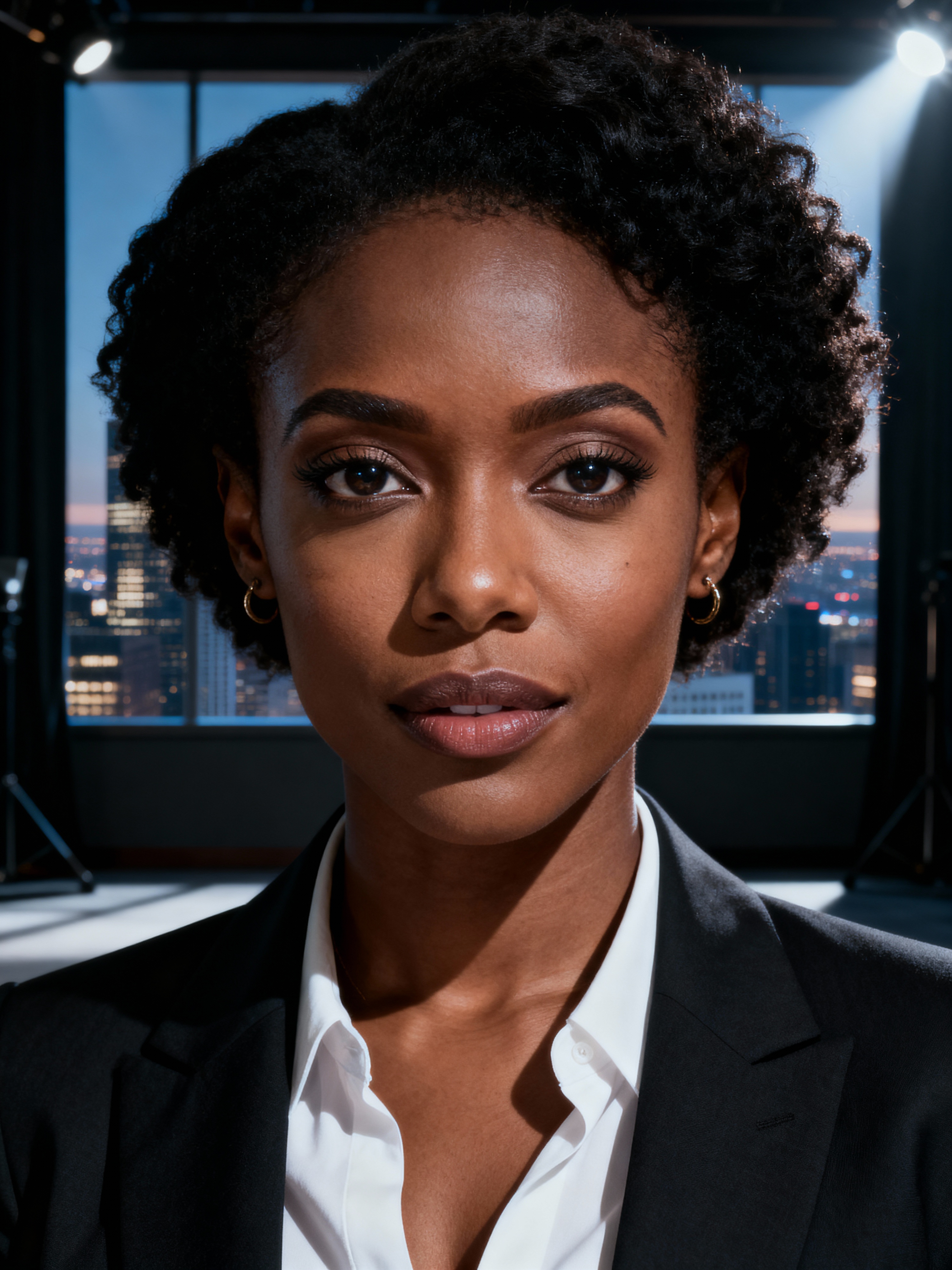 8k professional headshot of model, crisp details, studio backdrop, executive attire, confident posture, neutral expression, high-definition, corporate setting, sharp focus, ambient lighting, business professional, cityscape view