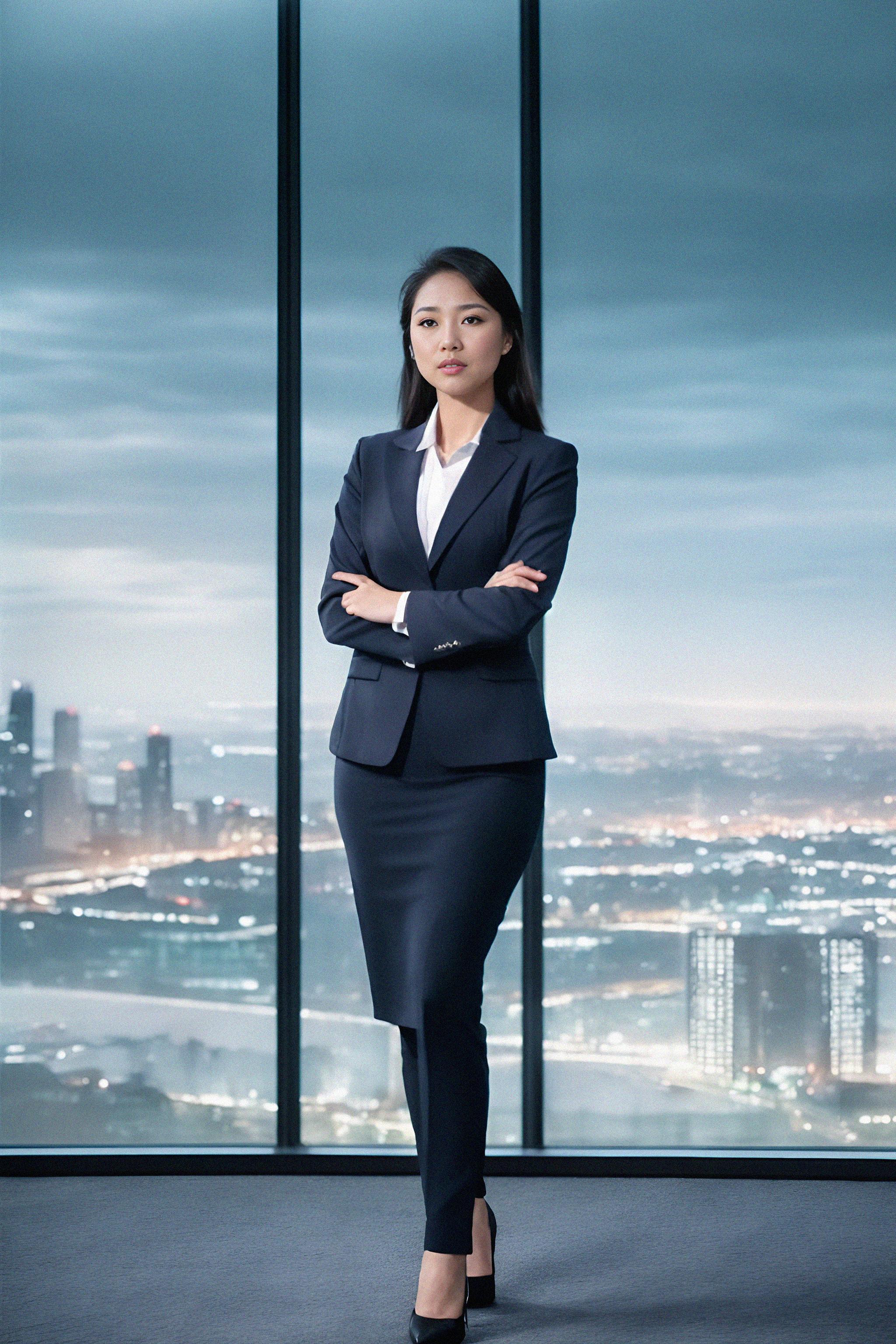 8k professional headshot of model, crisp details, studio backdrop, executive attire, confident posture, neutral expression, high-definition, corporate setting, sharp focus, ambient lighting, business professional, cityscape view