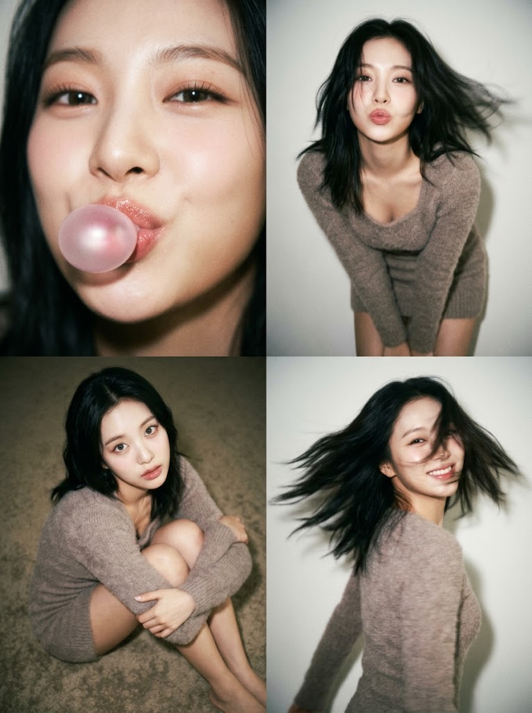 A 2x2 grid, 4-panel artistic film collage of a sexy Korean K-pop idol, pure desire aesthetic. **[Global Style]:** Heavy film grain, soft focus, dreamy Pro-Mist diffusion filter, motion blur from camera panning, vintage color grading, flash photography. **[Panel 1 Top-Left Replacement]:** Close-up, blowing a small pink bubble gum, playful expression, focus on the bubble and lips, soft film grain. **[Panel 2 Top-Right]:** Medium shot, she is leaning forward towards the lens, wearing a fuzzy taupe knit mini dress, alluring pout, shaking hair with motion blur. **[Panel 3 Bottom-Left]:** Full body shot, seated on the floor, hugging knees, innocent but sexy posture, looking up at camera. **[Panel 4 Bottom-Right]:** A dynamic candid shot of her turning around, hair whipping across face, motion blur, looking back over shoulder with a smile. The images are arranged in a seamless square grid layout.