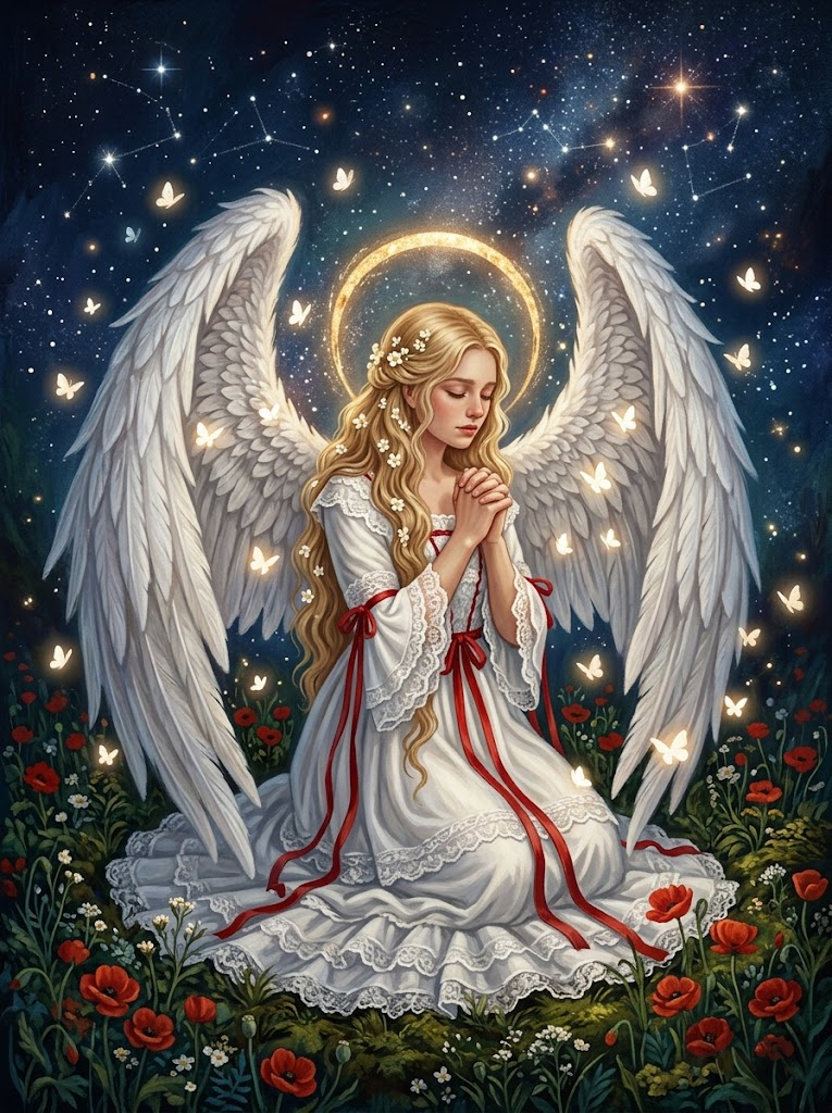A beautiful serene angel with long wavy blonde hair adorned with white flowers, kneeling in prayer with hands clasped and eyes closed, large intricate white feathered wings, golden textured halo behind her head, wearing a flowing white dress with lace details and red ribbons, surrounded by glowing white butterflies and red poppies at the bottom, dark starry night sky background with subtle sparkles, highly detailed, ethereal, soft lighting, fantasy art, intricate textures, warm golden tones contrasting cool blues.