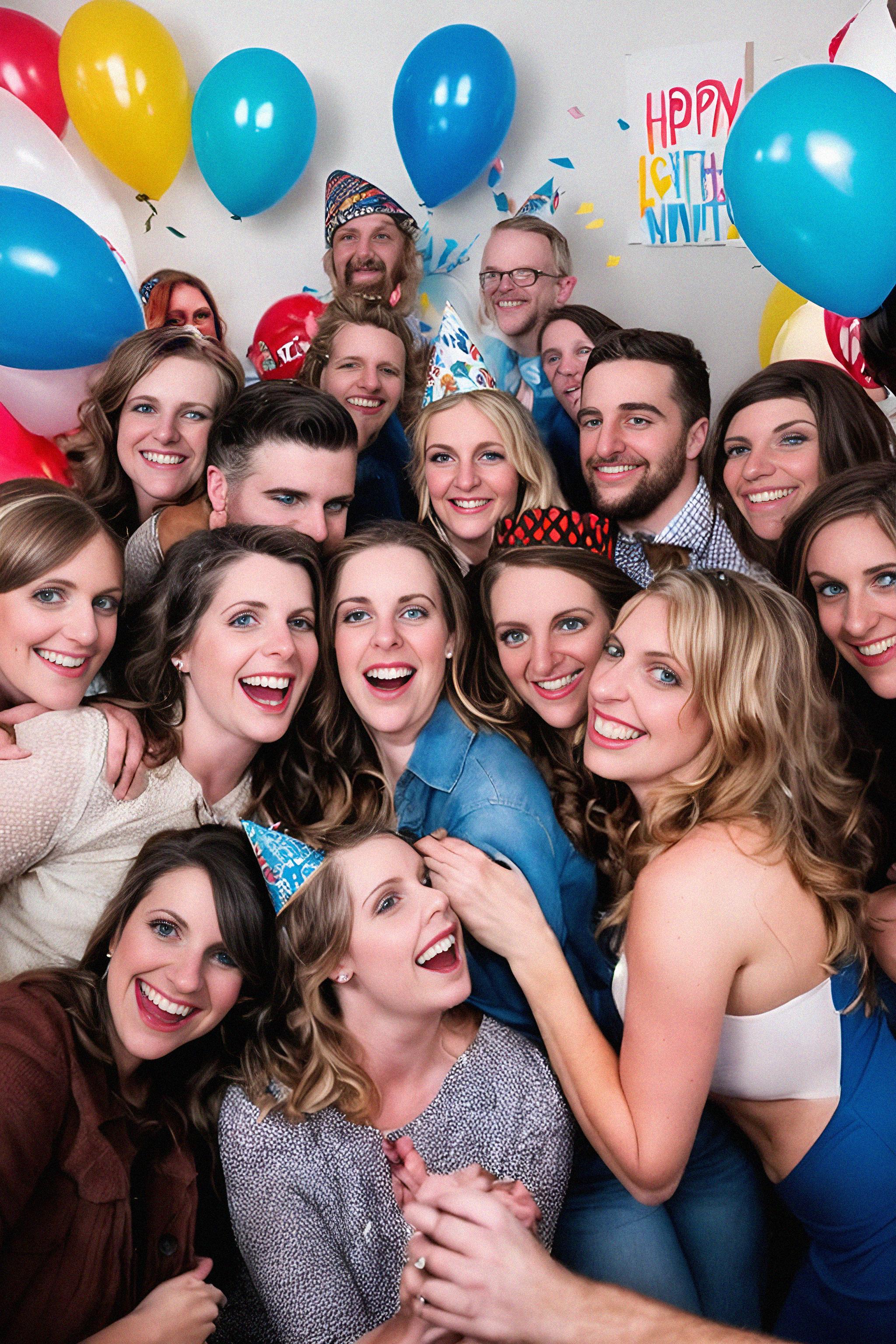 a birthday celebrant surrounded by friends and loved ones, engaging in a group hug or a playful group pose, symbolizing the love and support shared on this special occasion