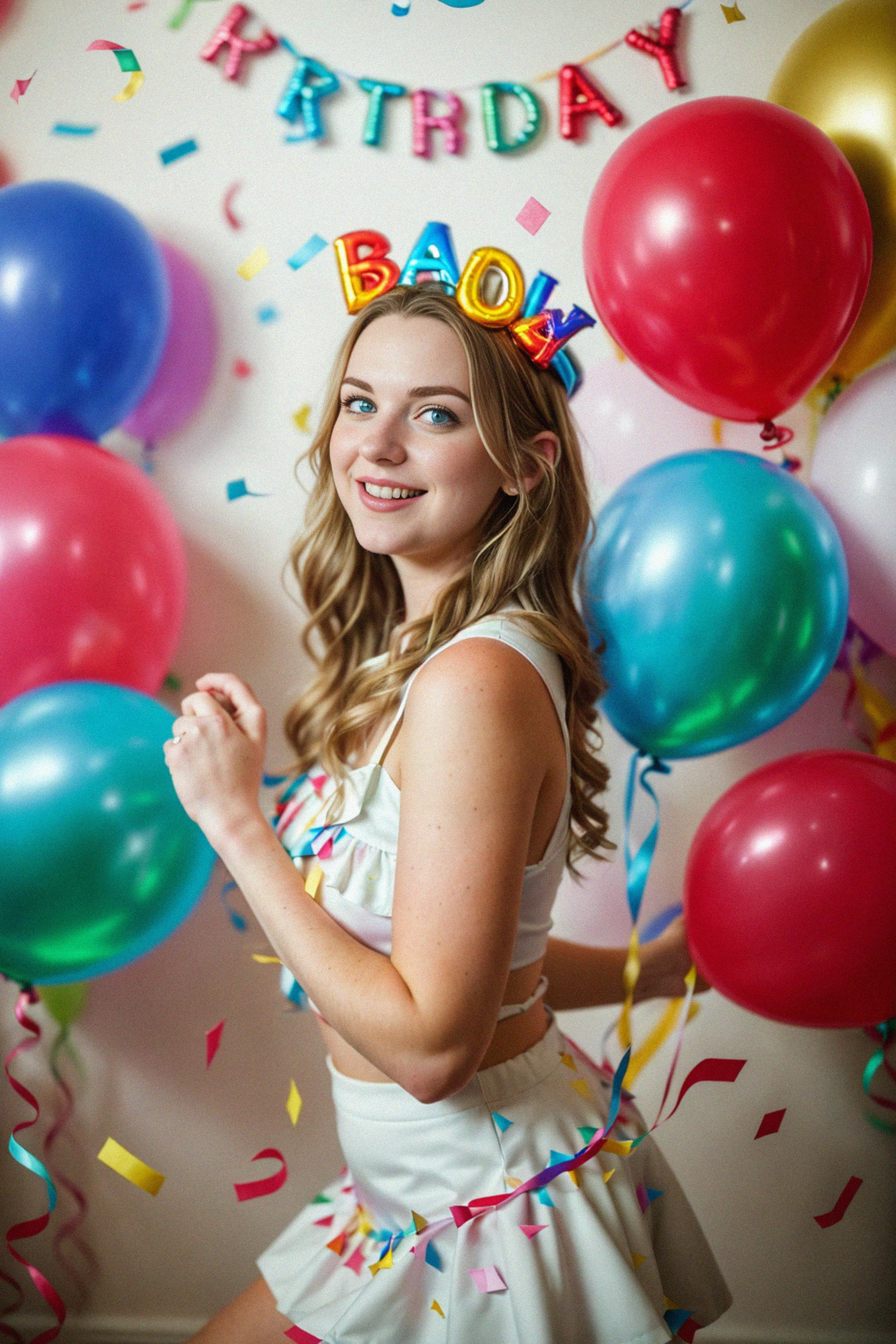 a birthday party scene, with balloons, streamers, and confetti, capturing the festive atmosphere and the anticipation of a fun-filled celebration