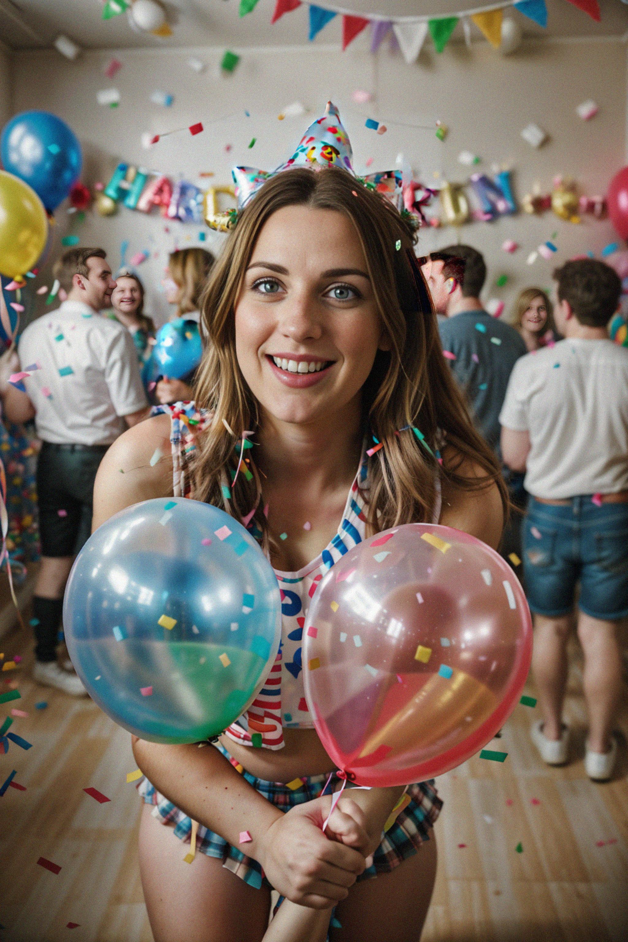a birthday party scene, with balloons, streamers, and confetti, capturing the festive atmosphere and the anticipation of a fun-filled celebration