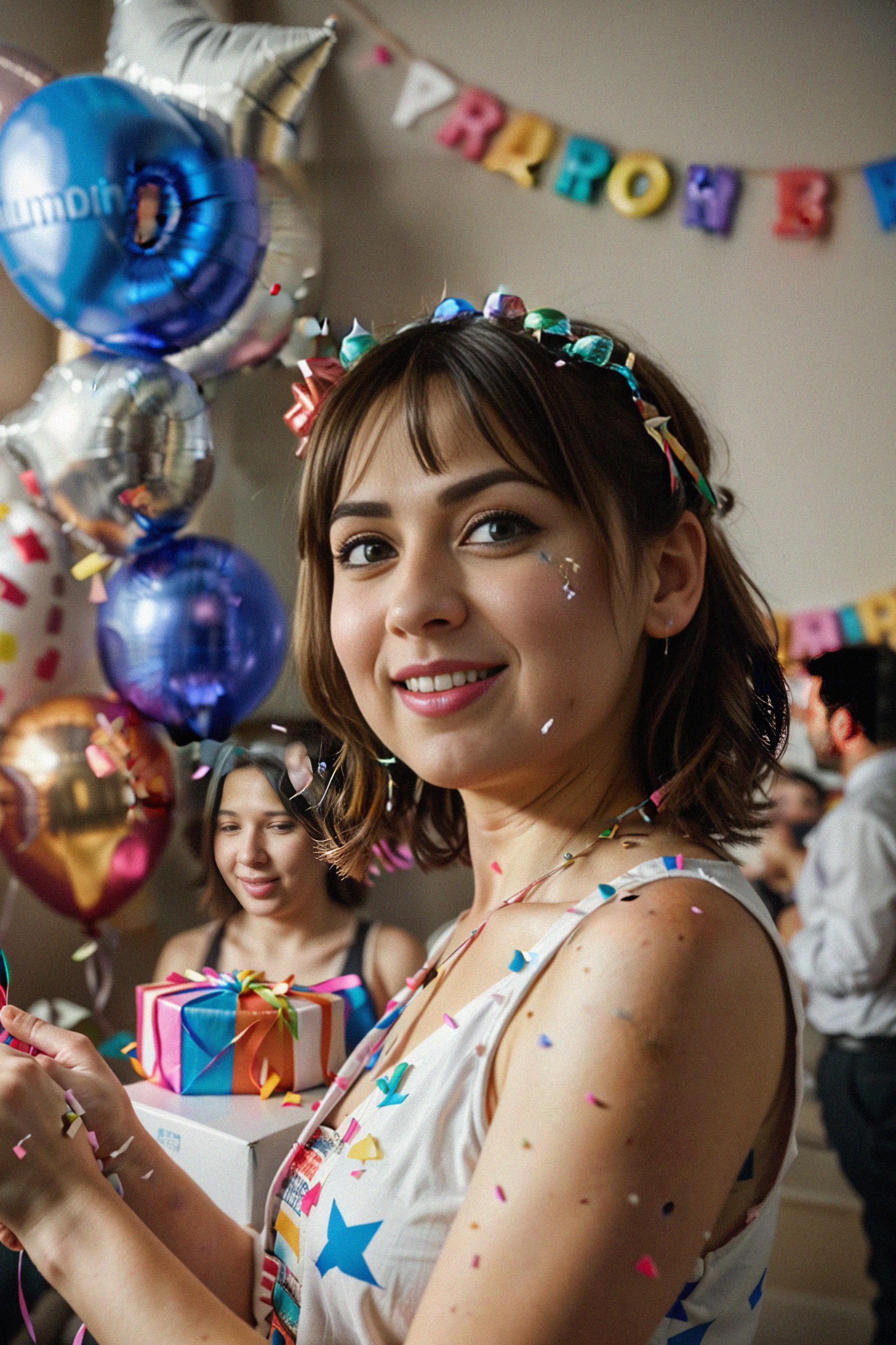 a birthday party scene, with balloons, streamers, and confetti, capturing the festive atmosphere and the anticipation of a fun-filled celebration