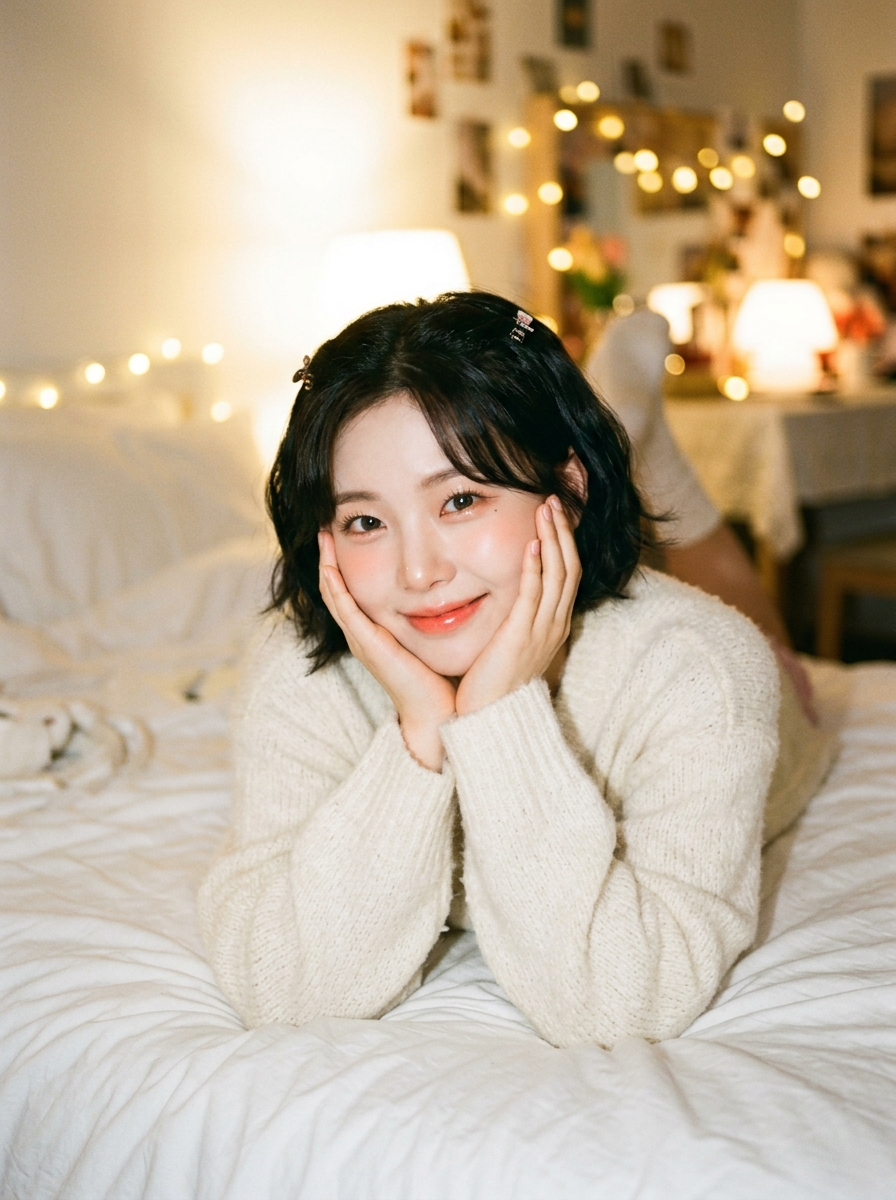A candid film photograph of a cute Korean K-pop idol girl in her early 20s, lying on her stomach on a bed at night. She is smiling warmly and tilting her head, hands cupping her face in a cute flower pose, looking directly into the camera with innocent, sparkling eyes. Japanese airy film style, overexposed highlights, soft focus, warm grain, dreamlike atmosphere. She has a fluffy dark bob haircut with small hair clips, wearing an oversized cream-colored fuzzy knit sweater. Her makeup is fresh and peachy with aegyo-sal and glossy lips. The bedroom is brightly lit by warm ambient lights and soft lamps, creating a soft glow and halation effect, despite being nighttime. Rumpled white bedding, cozy cluttered background with warm bokeh lights. Film grain, natural textures, candid snapshot feel.