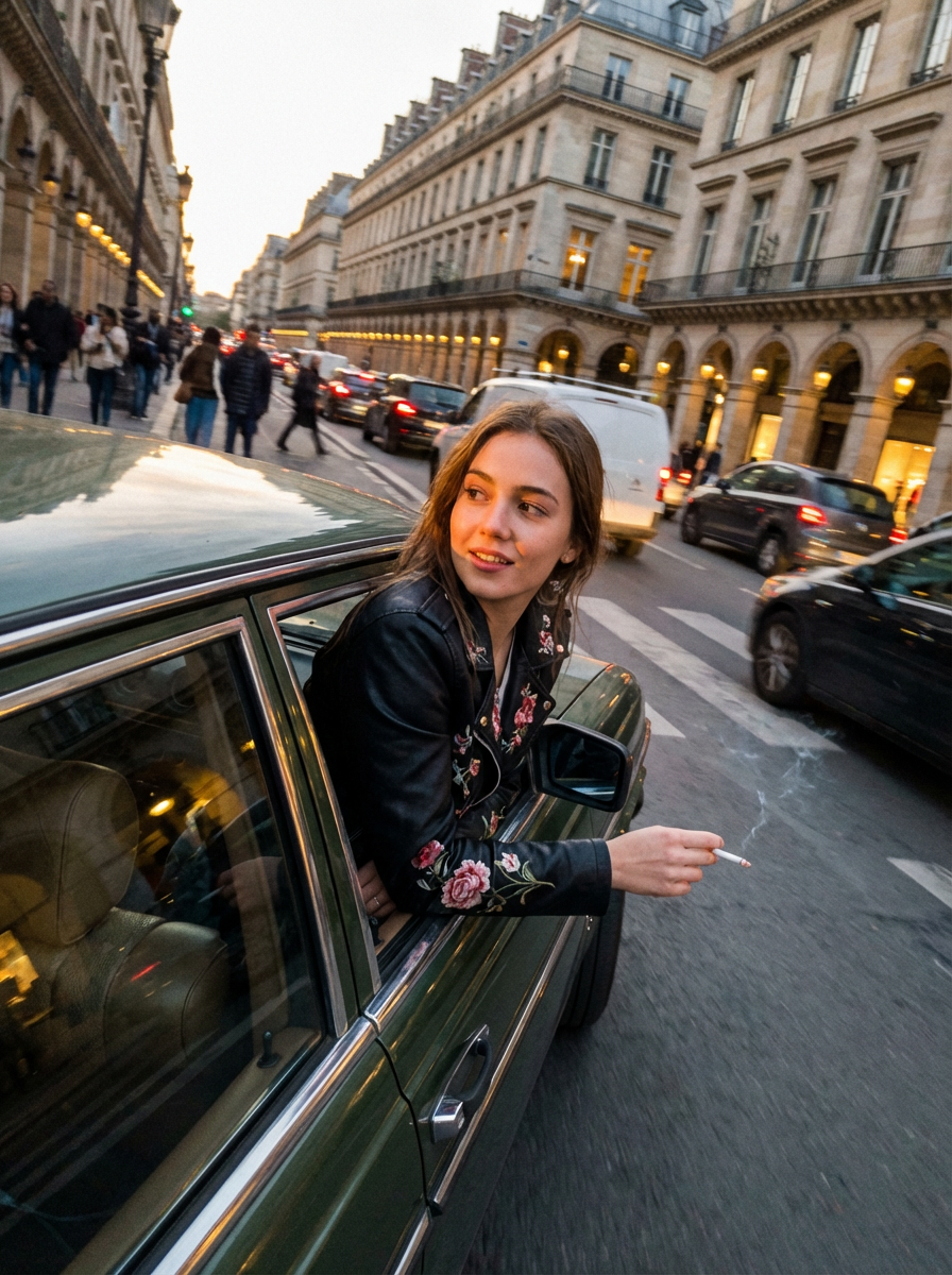 A candid, spontaneous snapshot of a young model leaning casually out of the window of a vintage car, captured on a bustling European city street at dusk. Warm, natural twilight softly illuminates his relaxed face, highlighting authentic skin texture and the subtle wisp of smoke from his cigarette held loosely in hand. The background shows urban architecture and busy traffic with slight motion blur, emphasizing the car's motion without losing the crisp sharpness of the subject. The composition is casually tilted and framed with genuine spontaneity, evoking the intimate, dynamic feel of authentic iPhone photography in cinematic RAW style. 1:1 aspect ratio