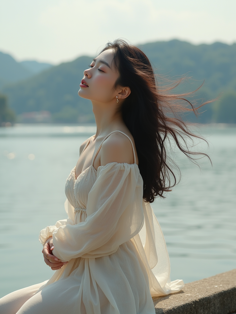 a captivating feminine model enjoying a peaceful moment by the waterfront