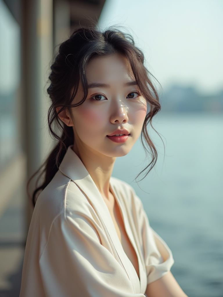 a captivating feminine model enjoying a peaceful moment by the waterfront