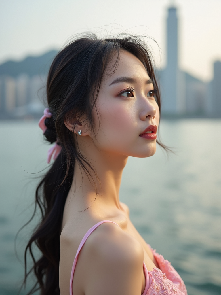 a captivating feminine model enjoying a peaceful moment by the waterfront