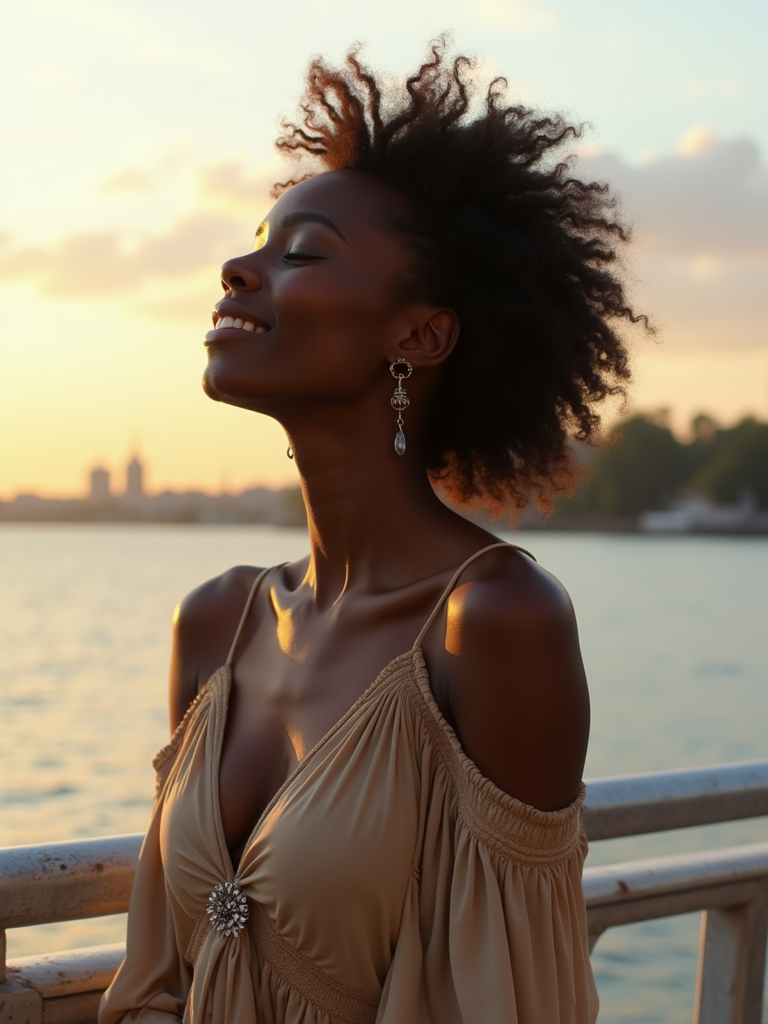 a captivating feminine model enjoying a peaceful moment by the waterfront