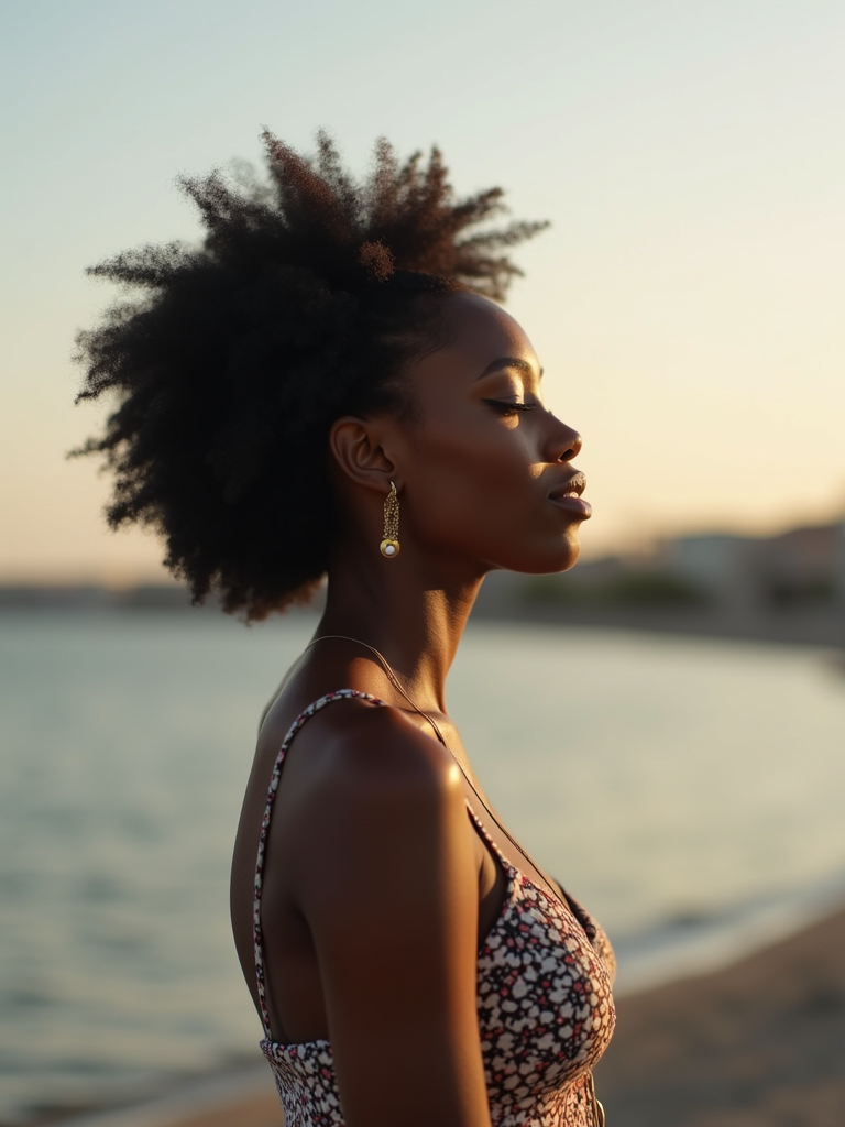 a captivating feminine model enjoying a peaceful moment by the waterfront