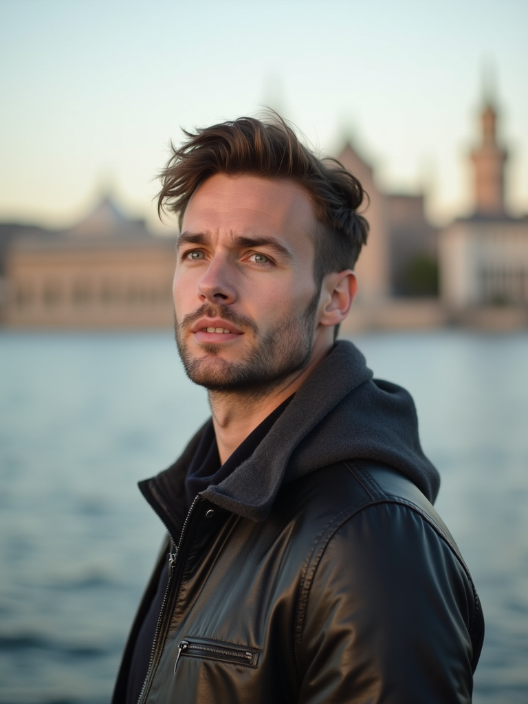 a captivating masculine model enjoying a peaceful moment by the waterfront