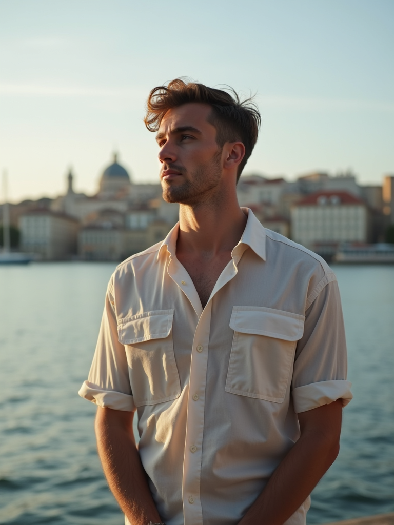 a captivating masculine model enjoying a peaceful moment by the waterfront