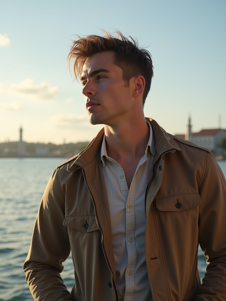 a captivating masculine model enjoying a peaceful moment by the waterfront