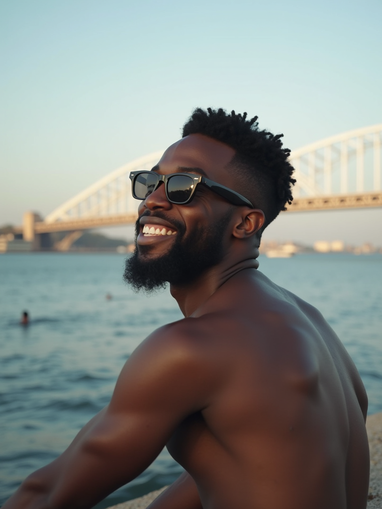 a captivating masculine model enjoying a peaceful moment by the waterfront