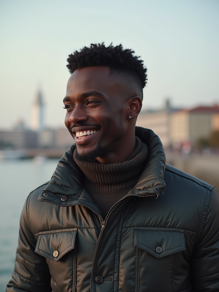 a captivating masculine model enjoying a peaceful moment by the waterfront