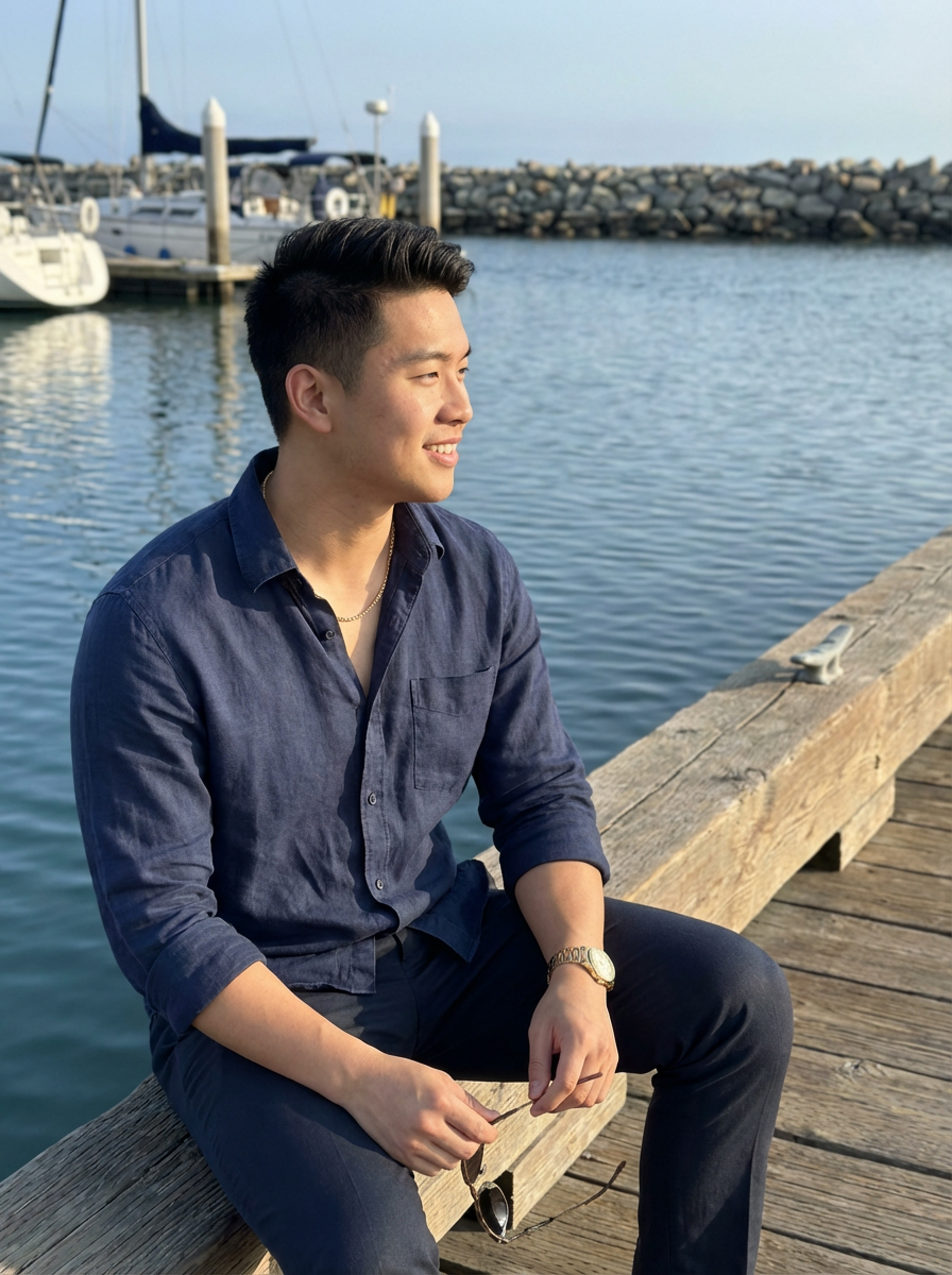 a captivating masculine model enjoying a peaceful moment by the waterfront