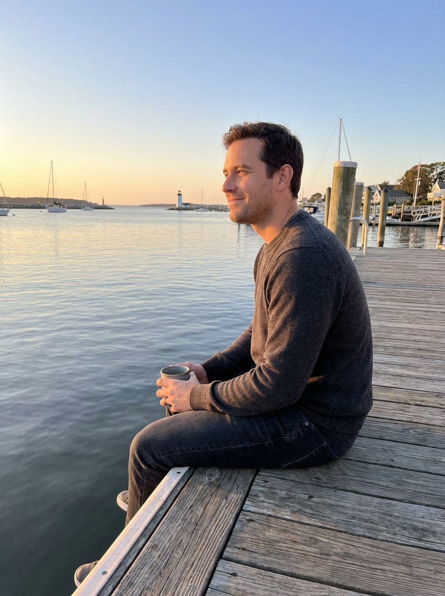 a captivating masculine model enjoying a peaceful moment by the waterfront