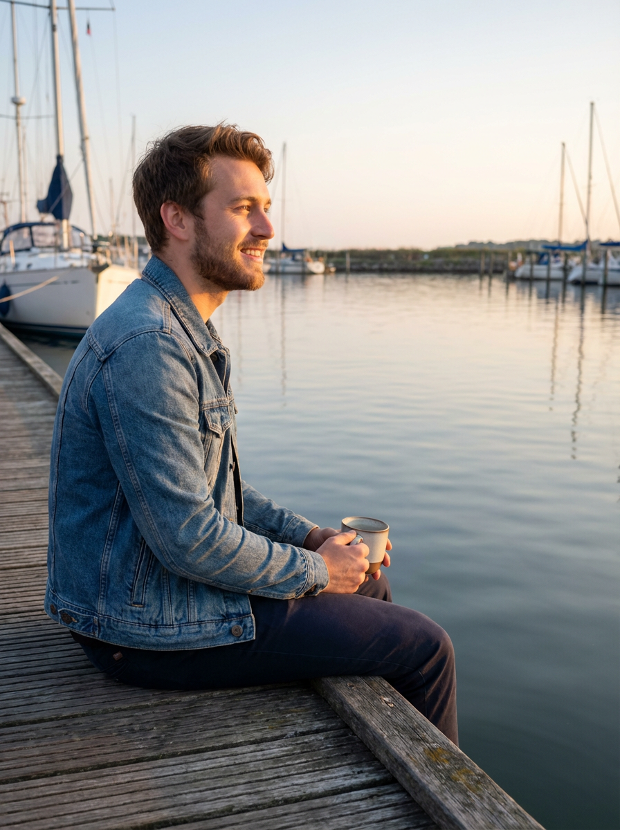 a captivating masculine model enjoying a peaceful moment by the waterfront