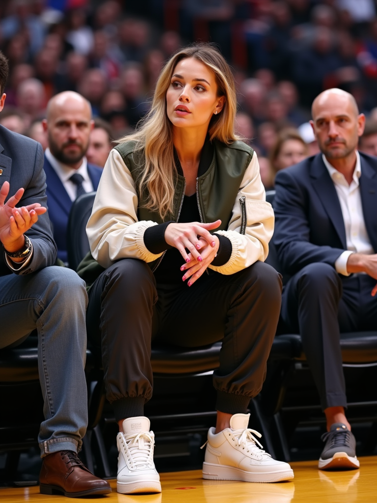 A celebrity attending a courtside NBA game, sitting in premium seats, clapping and reacting to an intense play. The model is wearing a chic sporty outfit with a stylish bomber jacket and luxury sneakers . The electric atmosphere of the game is visible in the background.