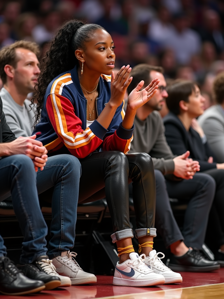 A celebrity attending a courtside NBA game, sitting in premium seats, clapping and reacting to an intense play. The model is wearing a chic sporty outfit with a stylish bomber jacket and luxury sneakers . The electric atmosphere of the game is visible in the background.