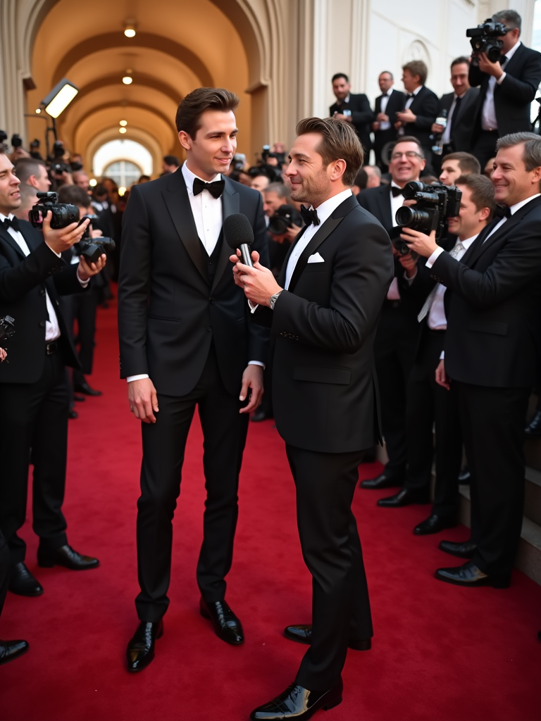 A celebrity being interviewed on the red carpet, speaking to an excited reporter while cameras flash around them. The model is wearing a three-piece designer suit with polished dress shoes. The energy of the crowd and press is buzzing in the background.