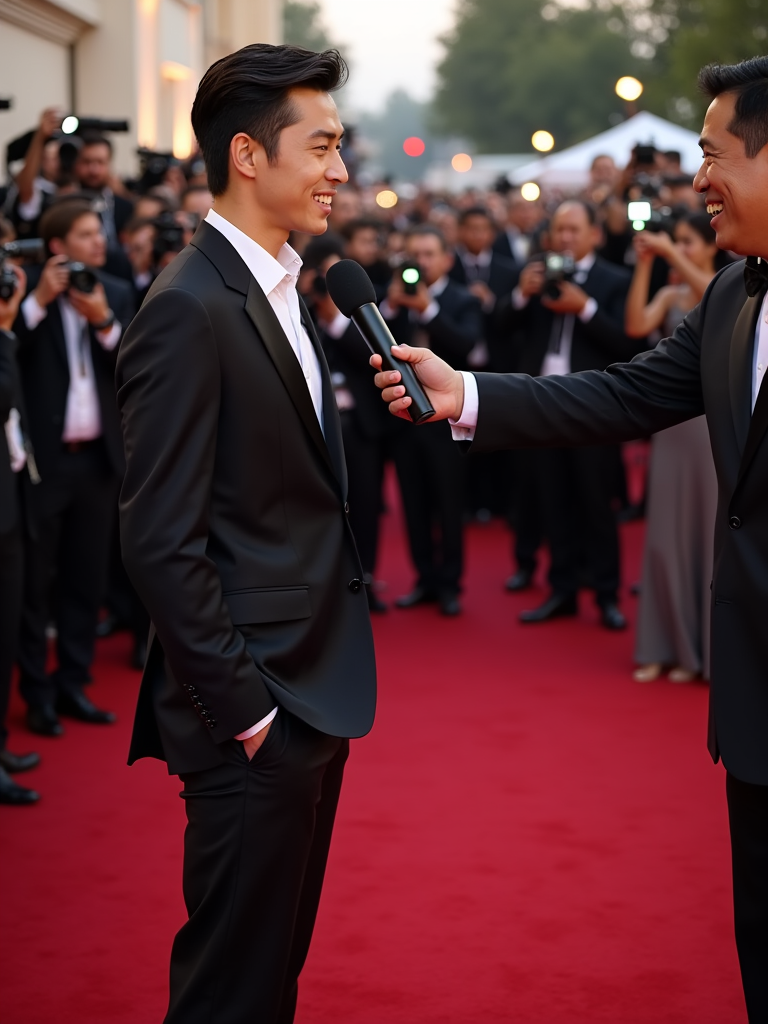 A celebrity being interviewed on the red carpet, speaking to an excited reporter while cameras flash around them. The model is wearing a three-piece designer suit with polished dress shoes. The energy of the crowd and press is buzzing in the background.