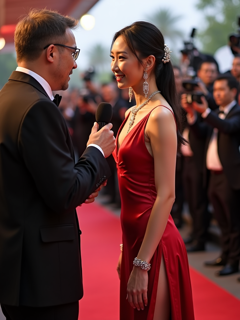 A celebrity being interviewed on the red carpet, speaking to an excited reporter while cameras flash around them. The model is wearing a custom-fitted high-slit gown with dazzling jewelry . The energy of the crowd and press is buzzing in the background.