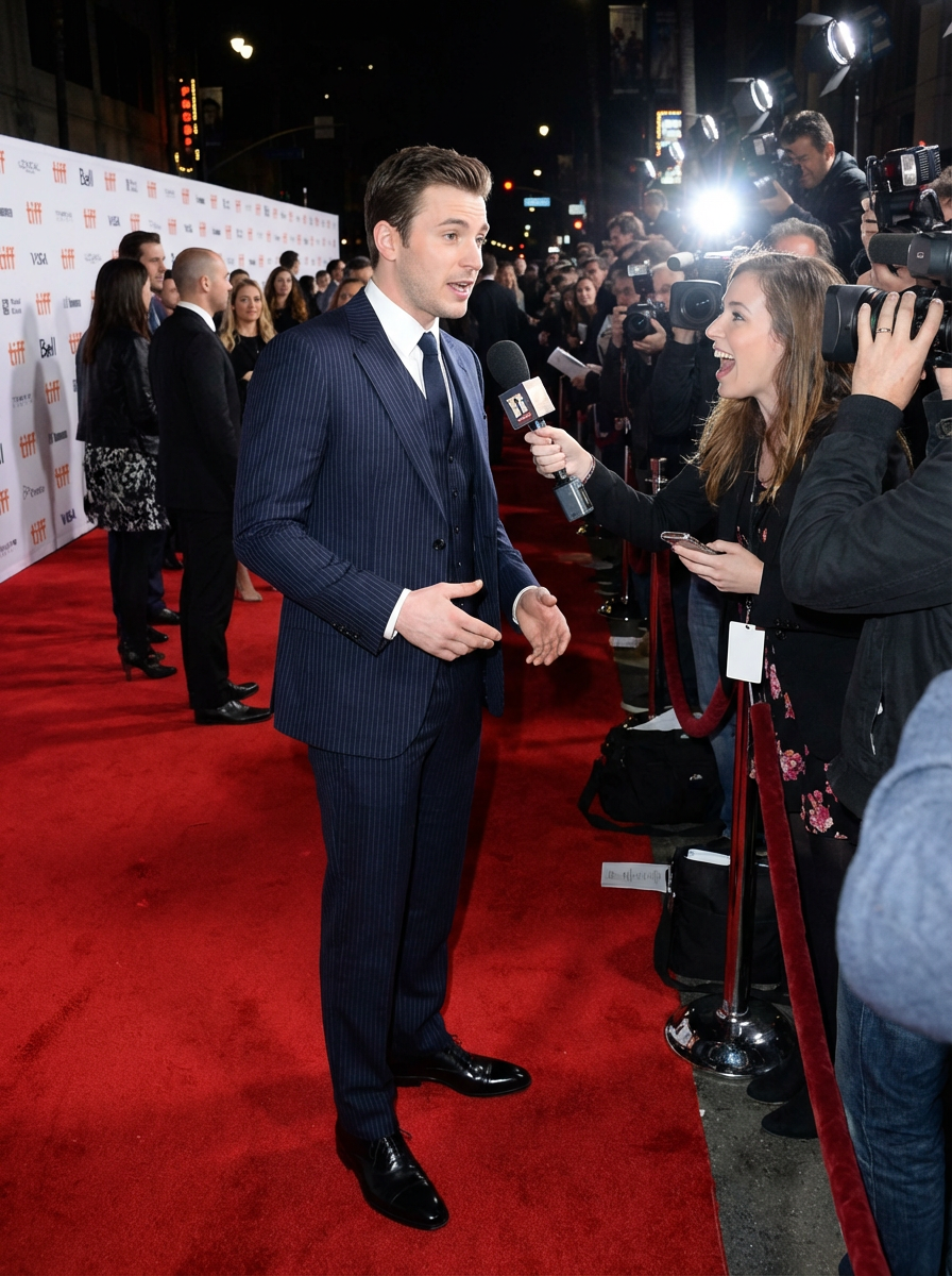 A celebrity being interviewed on the red carpet, speaking to an excited reporter while cameras flash around them. The model is wearing a three-piece designer suit with polished dress shoes. The energy of the crowd and press is buzzing in the background.