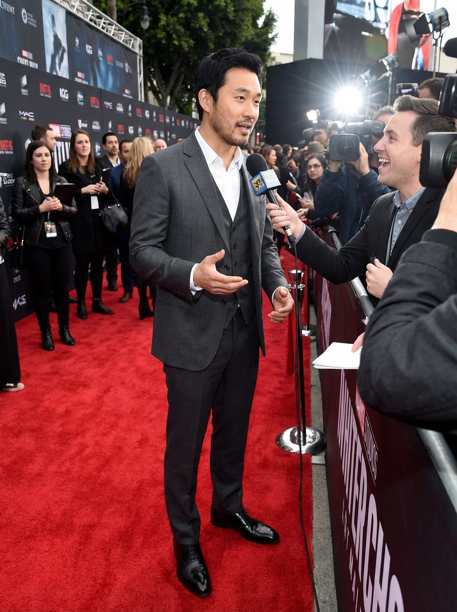 A celebrity being interviewed on the red carpet, speaking to an excited reporter while cameras flash around them. The model is wearing a three-piece designer suit with polished dress shoes. The energy of the crowd and press is buzzing in the background.