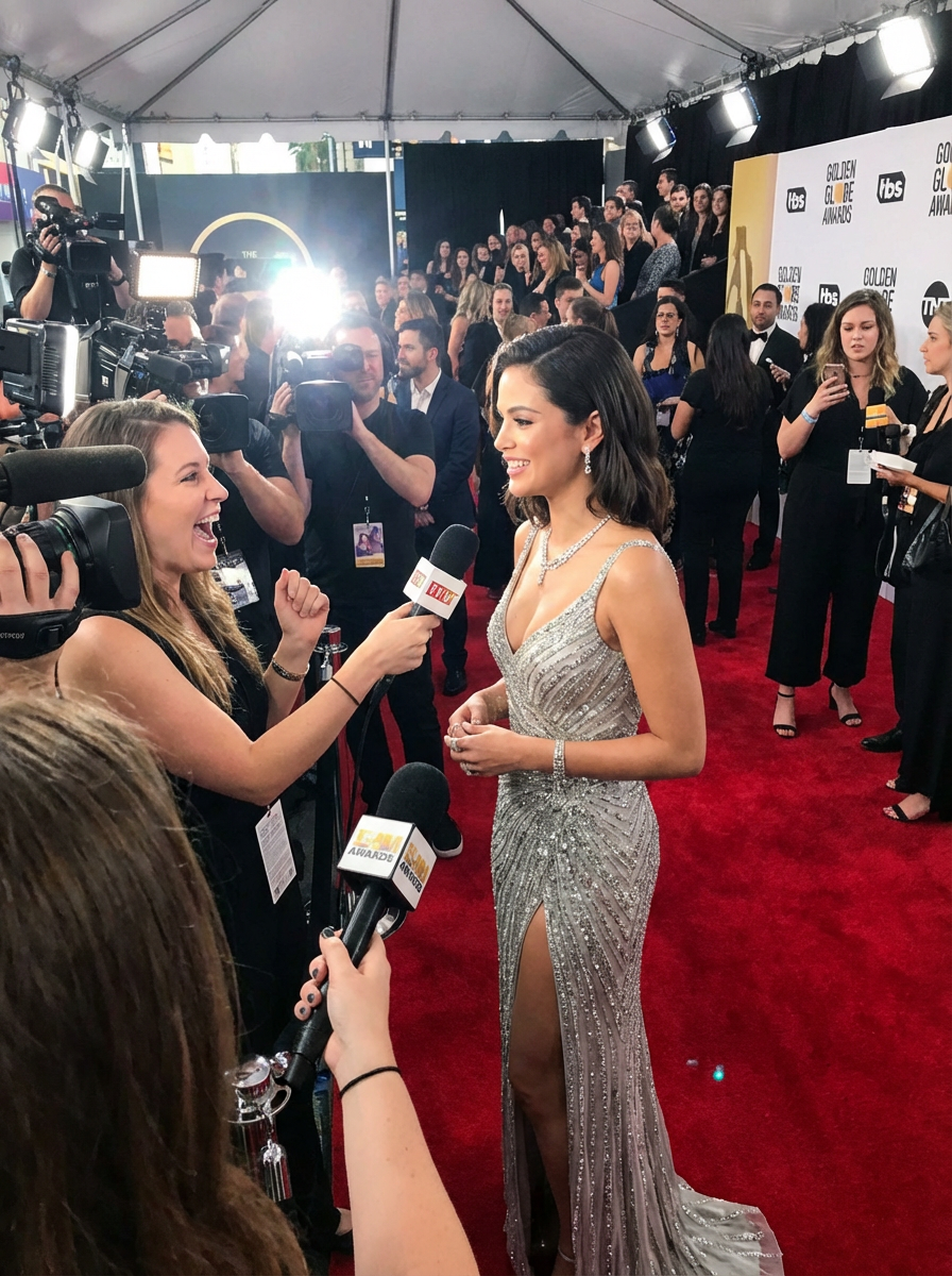 A celebrity being interviewed on the red carpet, speaking to an excited reporter while cameras flash around them. The model is wearing a custom-fitted high-slit gown with dazzling jewelry . The energy of the crowd and press is buzzing in the background.