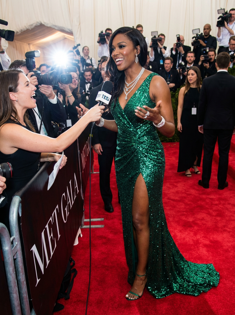 A celebrity being interviewed on the red carpet, speaking to an excited reporter while cameras flash around them. The model is wearing a custom-fitted high-slit gown with dazzling jewelry . The energy of the crowd and press is buzzing in the background.
