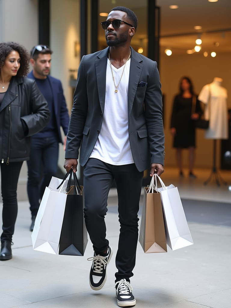 A celebrity being spotted by paparazzi while shopping in Beverly Hills, carrying multiple high-end brand shopping bags. The model is wearing a fitted blazer over a plain white tee, paired with designer sneakers. The setting includes a high-end retail street with boutique storefronts in the background.