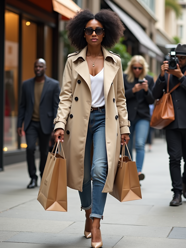 A celebrity being spotted by paparazzi while shopping in Beverly Hills, carrying multiple high-end brand shopping bags. The model is wearing a stylish designer trench coat with luxury sunglasses and high heels . The setting includes a high-end retail street with boutique storefronts in the background.