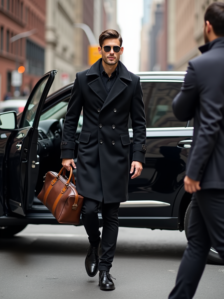 A celebrity leaving a five-star hotel in New York City, getting into a luxury black SUV while paparazzi take photos. The model is wearing a sharp overcoat with polished dress shoes and a leather duffle bag. The urban cityscape, featuring classic New York architecture, is visible in the background.