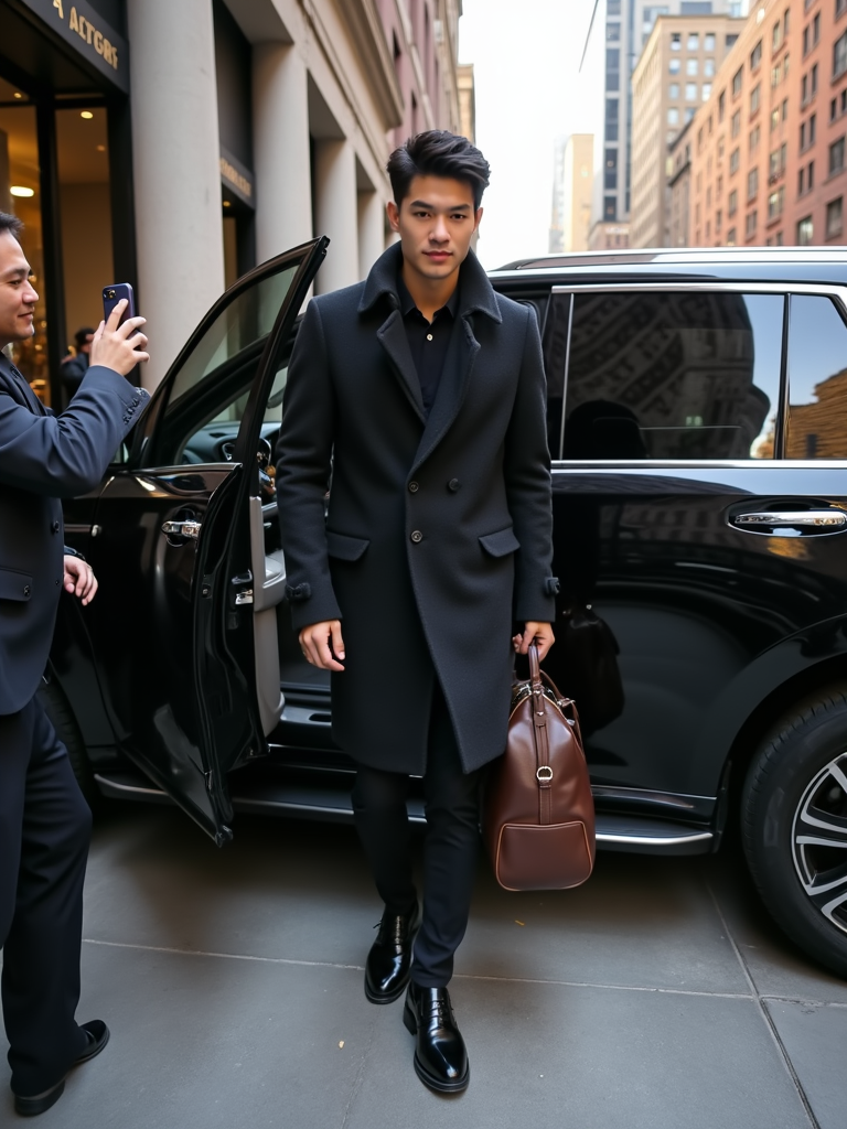 A celebrity leaving a five-star hotel in New York City, getting into a luxury black SUV while paparazzi take photos. The model is wearing a sharp overcoat with polished dress shoes and a leather duffle bag. The urban cityscape, featuring classic New York architecture, is visible in the background.
