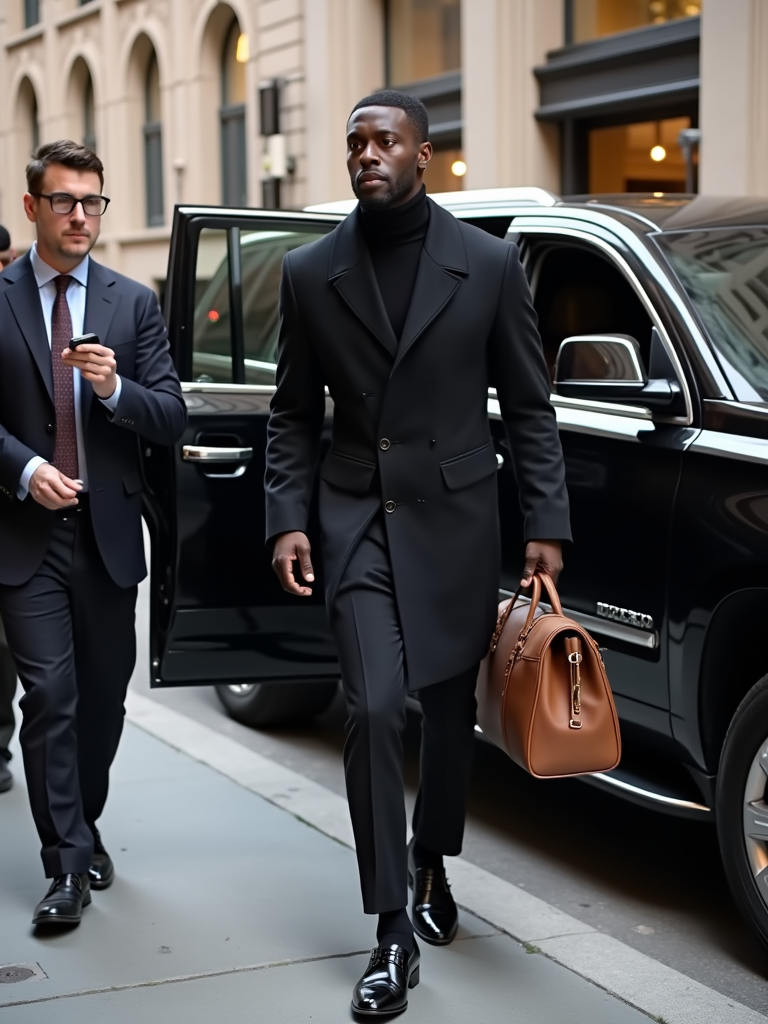 A celebrity leaving a five-star hotel in New York City, getting into a luxury black SUV while paparazzi take photos. The model is wearing a sharp overcoat with polished dress shoes and a leather duffle bag. The urban cityscape, featuring classic New York architecture, is visible in the background.