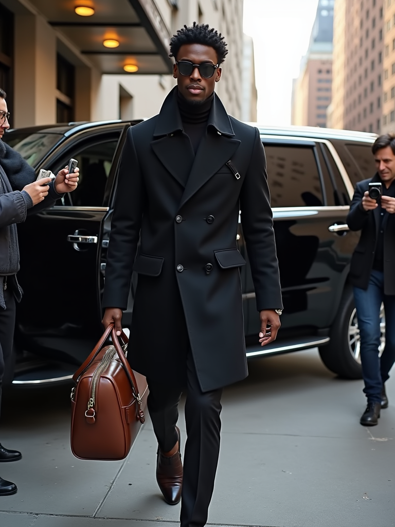 A celebrity leaving a five-star hotel in New York City, getting into a luxury black SUV while paparazzi take photos. The model is wearing a sharp overcoat with polished dress shoes and a leather duffle bag. The urban cityscape, featuring classic New York architecture, is visible in the background.