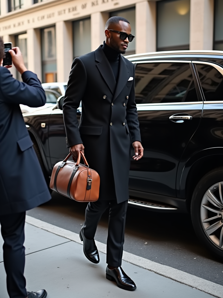 A celebrity leaving a five-star hotel in New York City, getting into a luxury black SUV while paparazzi take photos. The model is wearing a sharp overcoat with polished dress shoes and a leather duffle bag. The urban cityscape, featuring classic New York architecture, is visible in the background.